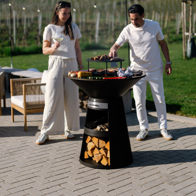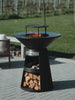Das Holzfach hebt die Feuerschale auf eine bequeme Höhe und ist nicht nur stylisch sondern auch perfekt zum Grillen.