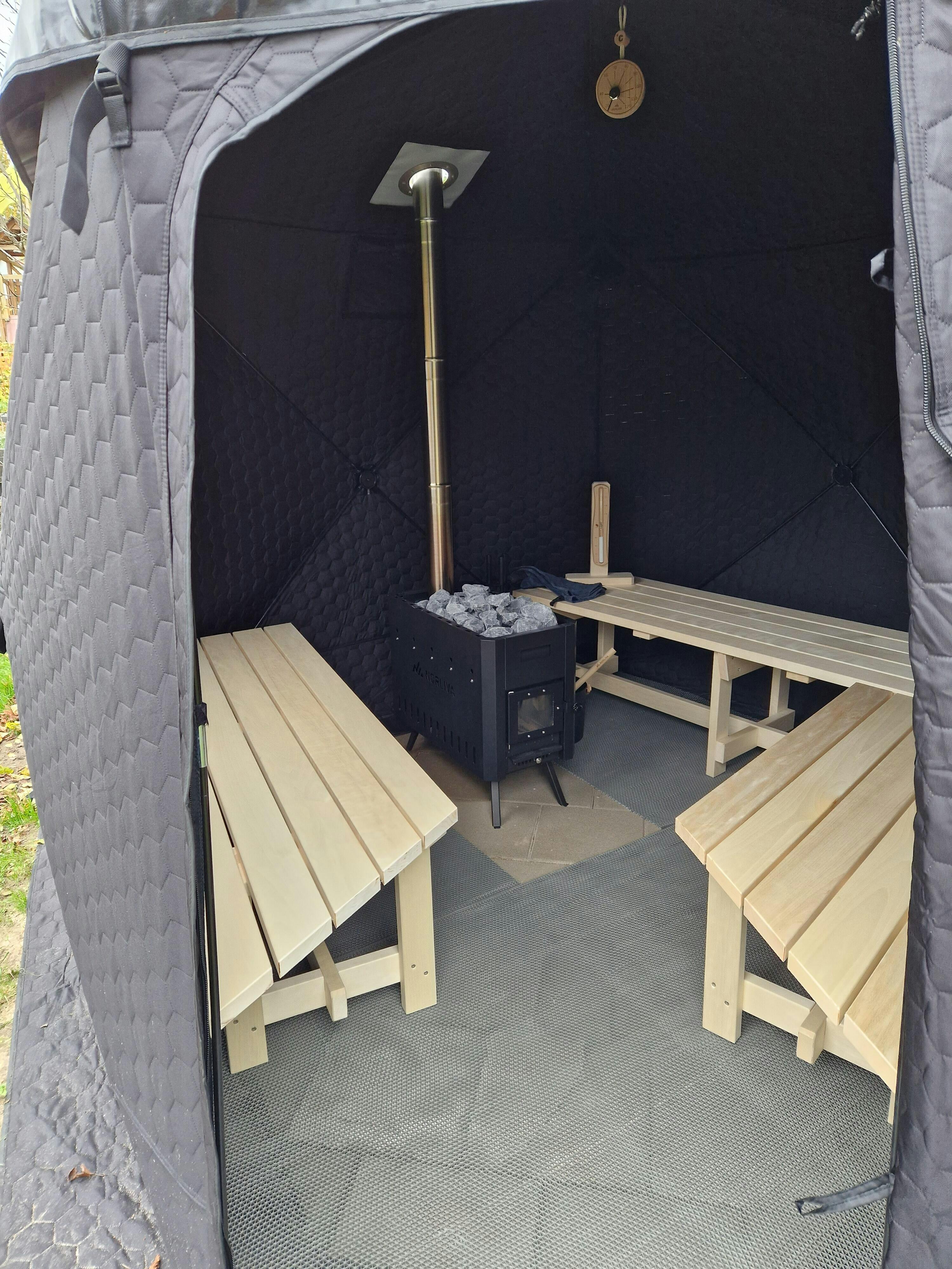 Wir sind sehr zufrieden und haben seit dem Aufbau schon viele ordentliche Saunaabende zelebriert. Entgegen einigen Bedenken heizt sich das Zelt auch bei Temperaturen um den Gefrierpunkt in der Spitze bis auf knapp 100*C auf. Auch der Platz reicht wie beschrieben gut für fünf Leute. Wir sind gespannt auf den Winter, sind aber guten Mutes dann auch ins Schwitzen zu kommen.