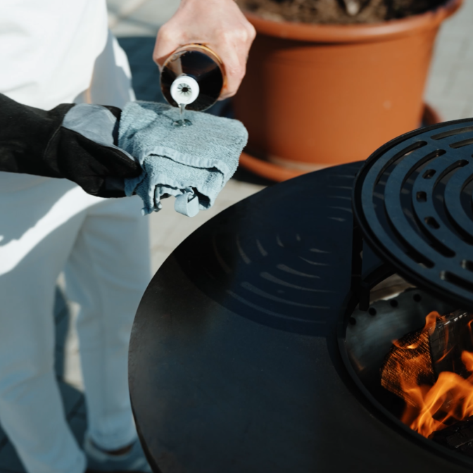 Die Asche wird oben aus dem Feuerkorb entfernt, verbleibende Rückstände lassen sich bequem über die integrierte Ascheschublade entsorgen.
