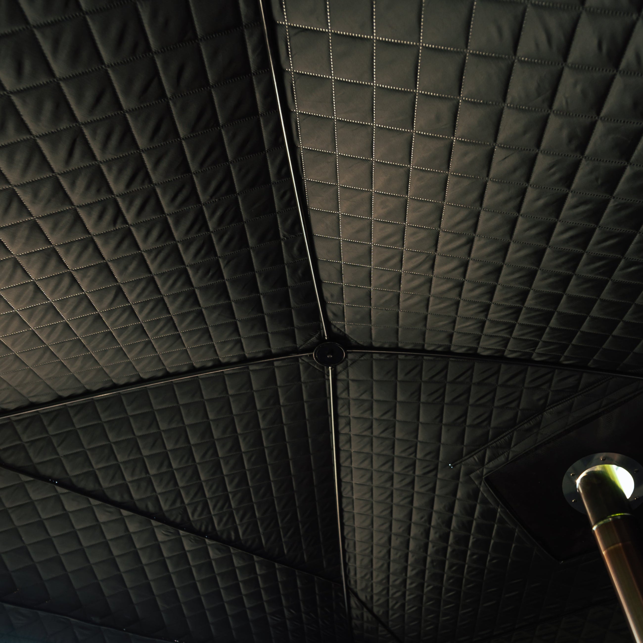 Das Zelt ist dreilagig aufgebaut: Innen und außen besteht es aus Oxford 420D-Gewebe, das wasserabweisend und flammhemmend beschichtet ist. Dazwischen befindet sich eine isolierende Polyesterschicht. Die Fenster bestehen aus klarem, flexiblem TPU-Kunststoff.